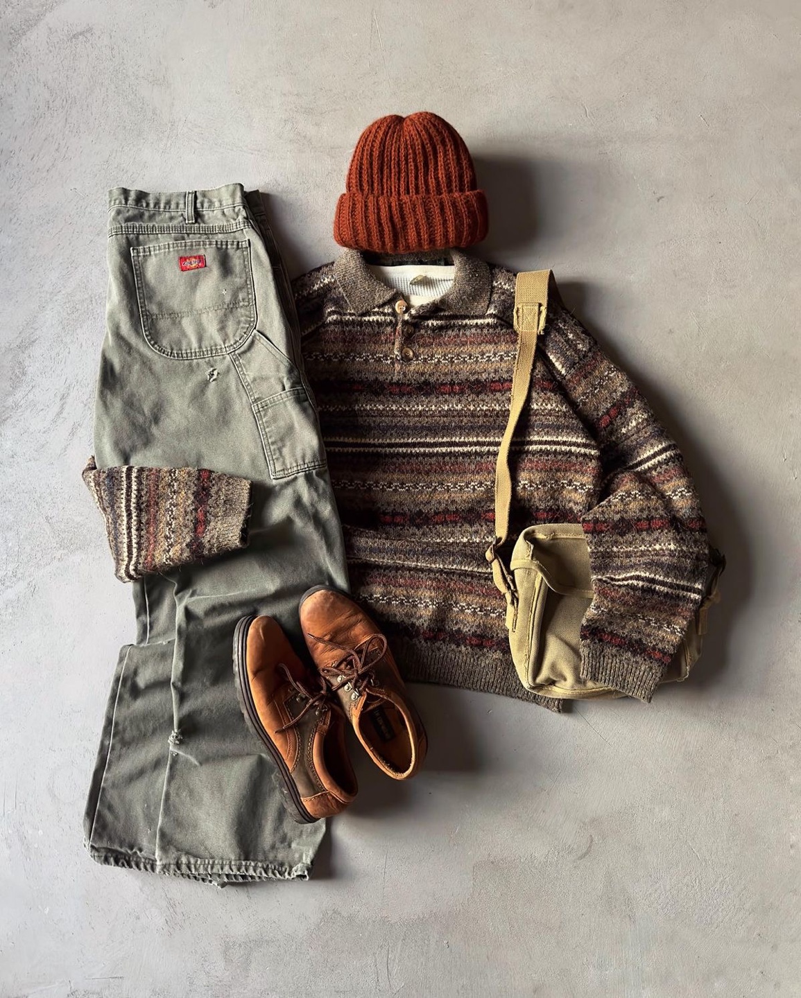 올드한 느낌의 패턴과, 전혀 입지 않을 법 한 컬러가 돋보이면서 편안한 느낌으로 다가온다면 그것이 바로 그랜파코어룩!